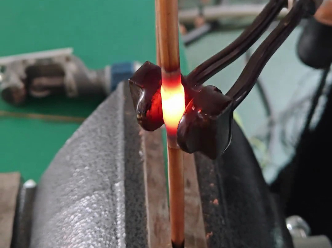 2. **高頻加熱**:手持感應(yīng)線圈套在焊環(huán)位置,保持線圈和銅管表面2 - 3mm的距離,啟動設(shè)備。高頻磁場會讓銅管和焊環(huán)快速發(fā)熱,一般10 - 20秒內(nèi)焊環(huán)就會熔融,看到焊料沿縫隙均勻流淌就說明加熱到位。要是用添加焊料的方式,等銅管加熱到發(fā)紅(約650℃)時,用鑷子夾著焊料接觸接口即可。